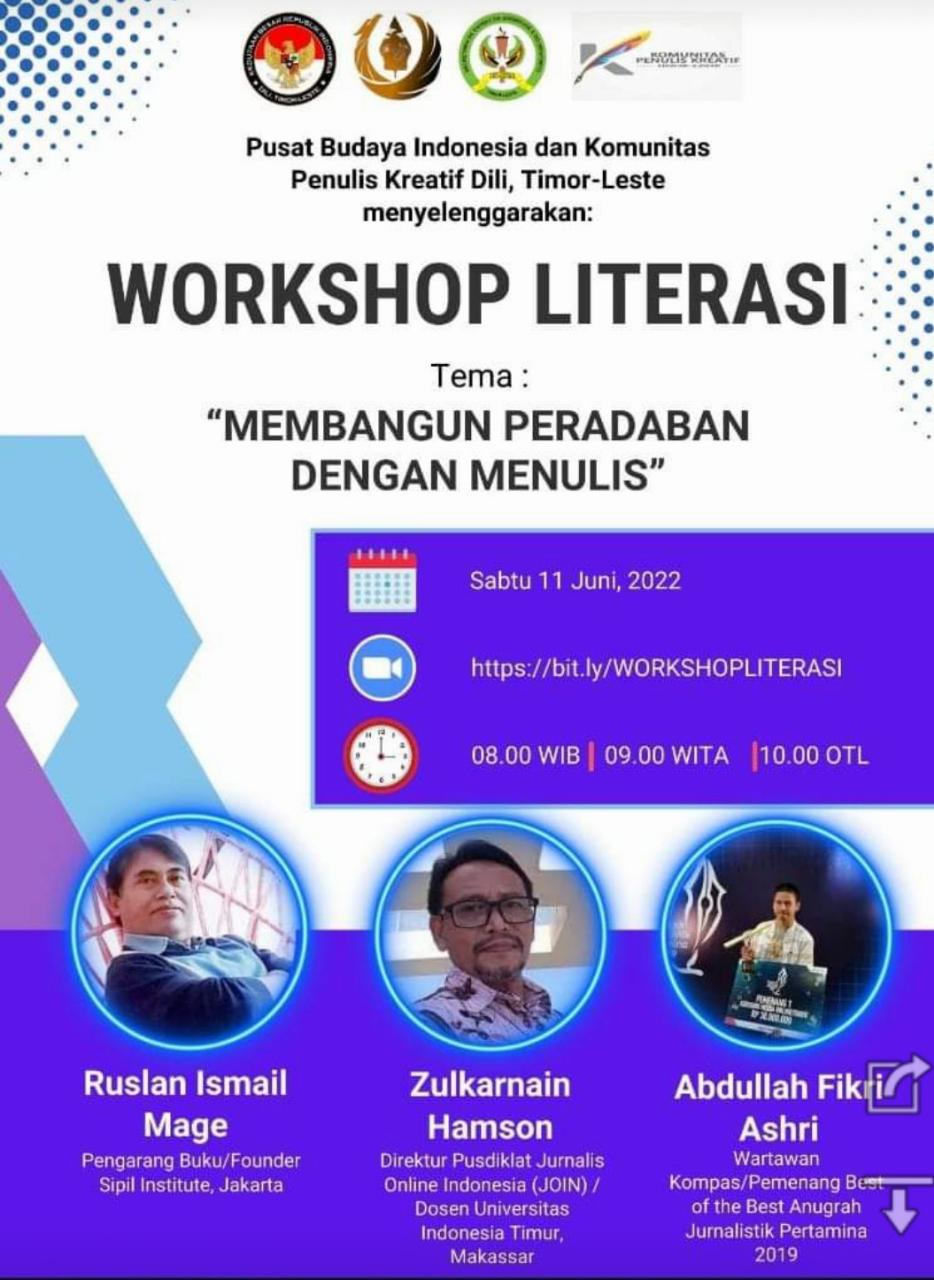 Kehadiran Atase baru yakni Bapak Prof.Dr.Phil.Ikhfan Haris M.Sc mensuport dan turut memberikan harapan serta motivasi baru menyangkut dunia Penulisan dan jurnalistik.Aku berterima kasih karena aku tidak tahu bagaimana caranya penerbitan dengan ISBN karena di TL ISBN memang belum ada.Akhirnya Atase baru meeting sebentar dengan aku membicarakan tentang kegiatan workshop Membangung Peradaban Dengan Menulis.Sejak hari itulah kebangaan datang secara tiba-tiba bahwa aku ingin mimpiku mengebangkan literasi dalam dunia penulisan bisa direalisasikan melalui kegiatan workshop ini karena aku sadar jika selama aku membangung cabang organisasi KPKers Timor-Leste banyak generasi muda yang memiliki impian hanya kurangnya motivasi.Dalam kesempatan selama pengajaran literasi konsep penulisan aku menemukan banyak generasi muda yang mampu jadi calon penulis di masa depan.