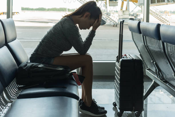 Passenger waiting at the airport terminal, stressed about missing her flight